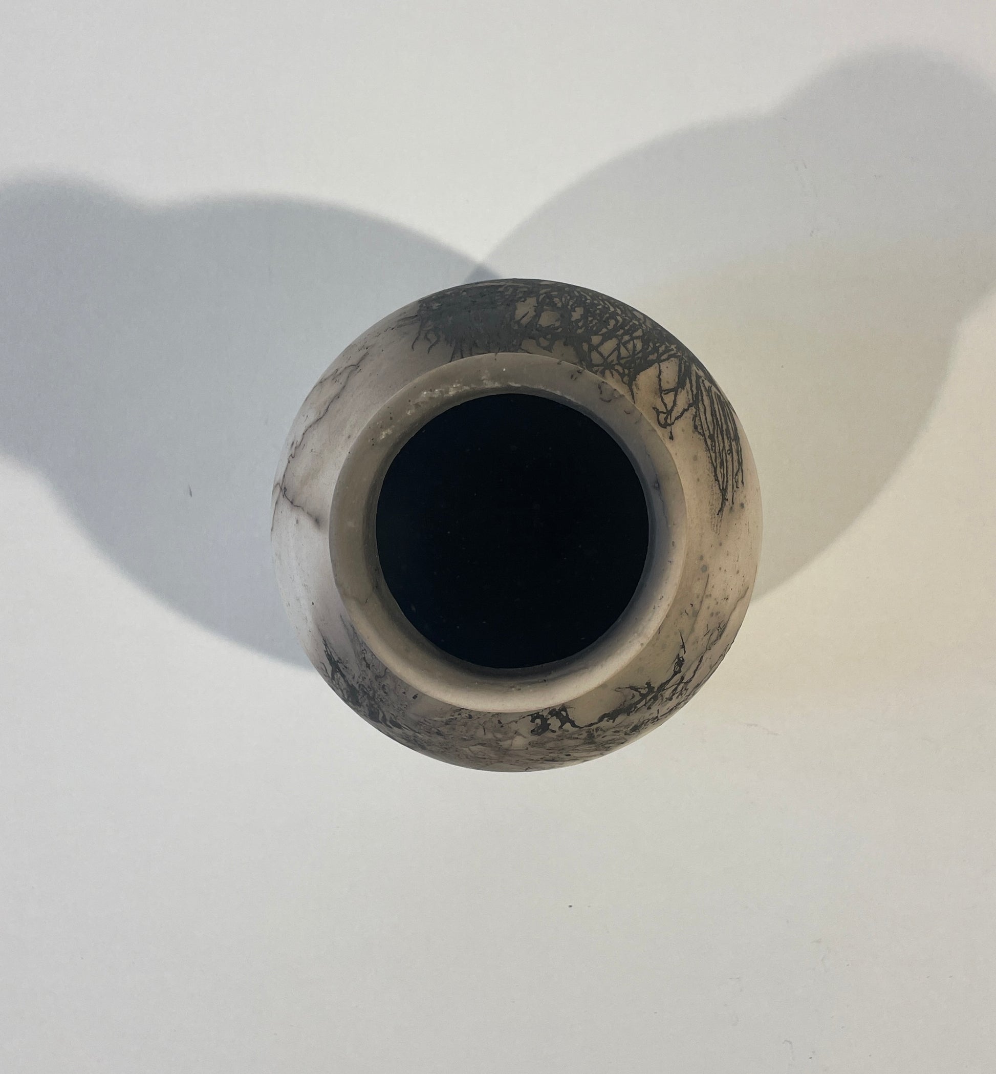 Denna vas är drejad för hand i stengodslera och bränd i lägre temperatur än traditionell stengods, vilket ger ett vackert, rått uttryck. Formen är mjukt rundad, 10,5 cm hög och 11,5 cm bred – ett dekorativt objekt i sig, eller perfekt för torkade blommor.